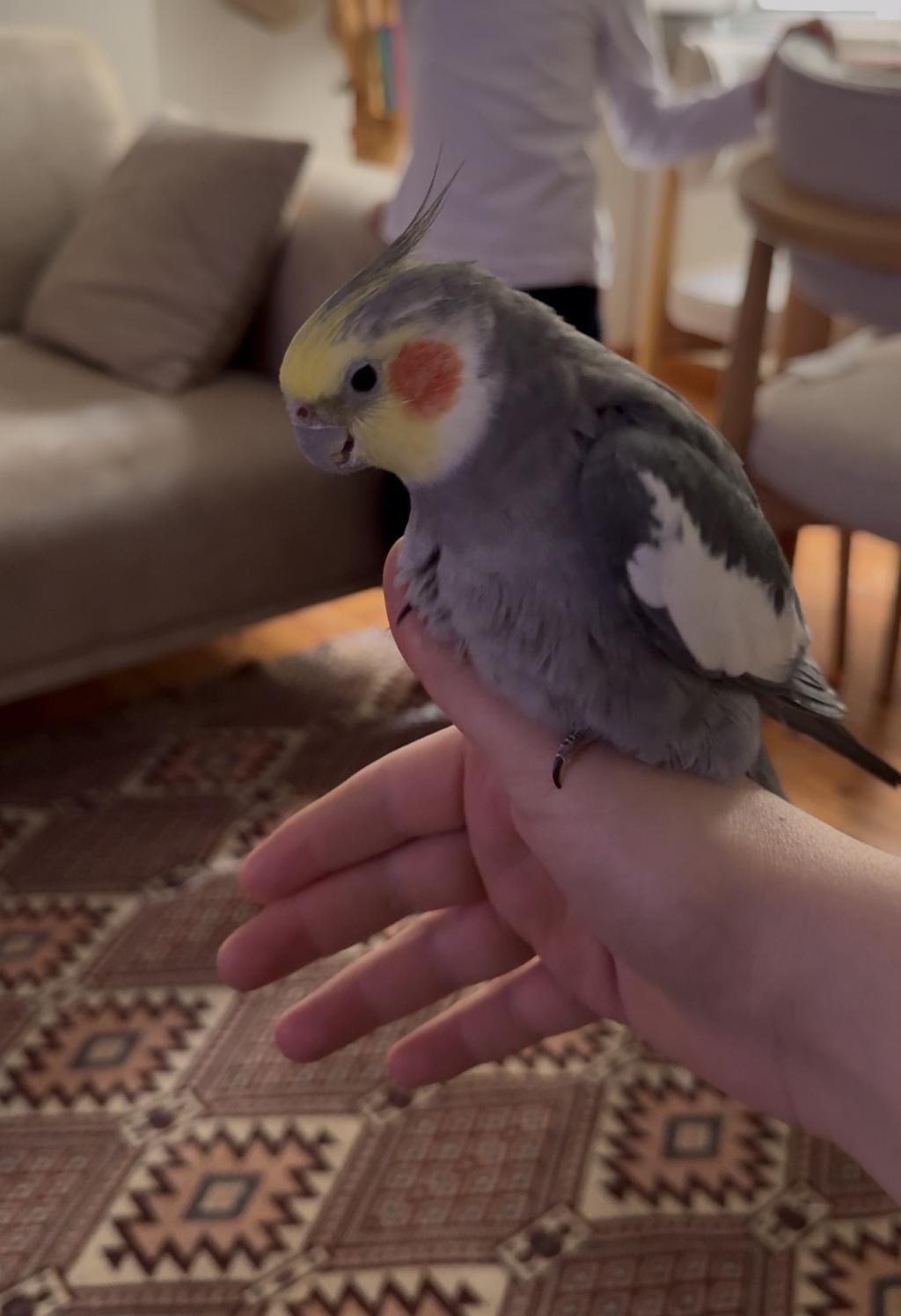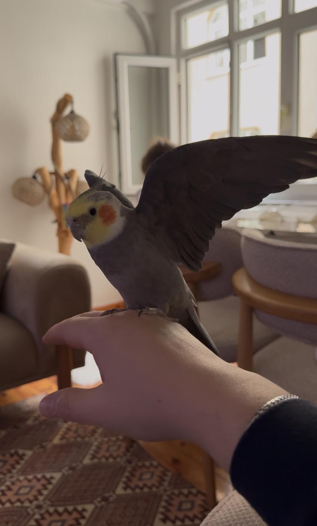 Ele alışıktır gayet sağlıklı uçması iyi babacık cici kuş gibi kelimeleri bilir melodik öter ıslık çalarsanız o da çalar tam bir ev papağanı