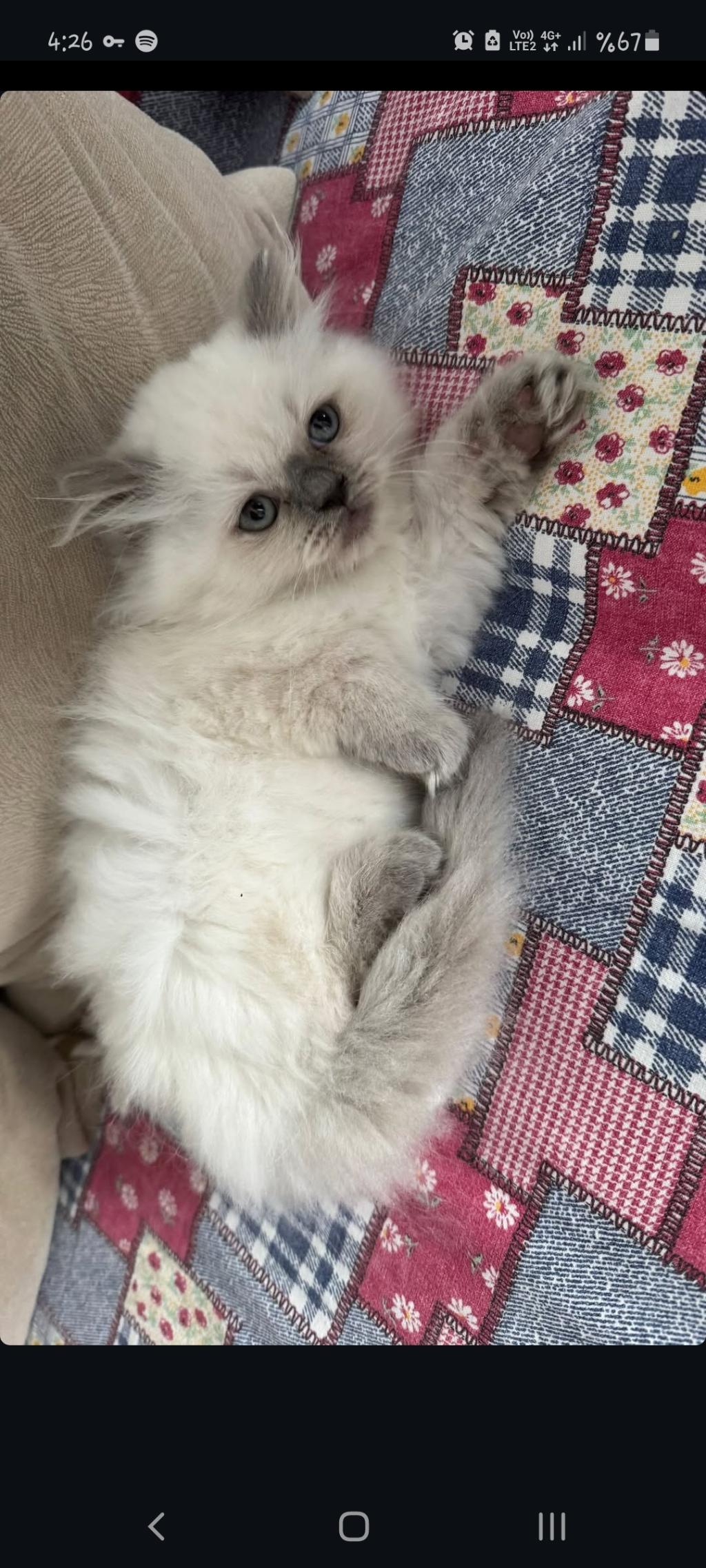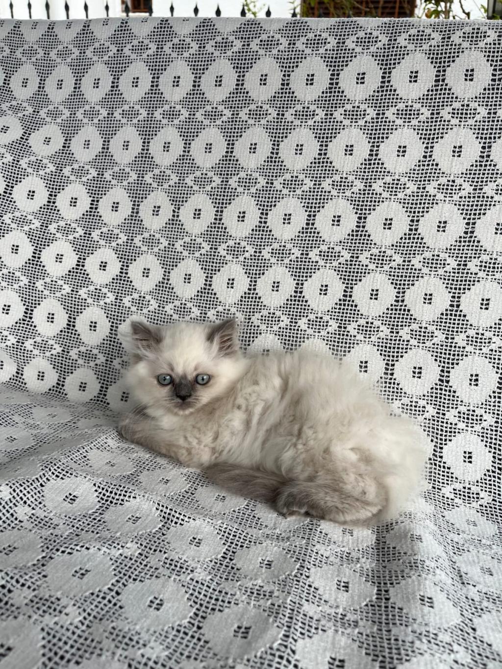 Yavrumuz 3 aylık, beyaz, British Blue Point cinsi bir erkek. Tuvalet eğitimi var. Annesi beyaz British Blue Point, babası gri Scottish Fold. Üç kardeşi sahiplendirildi.