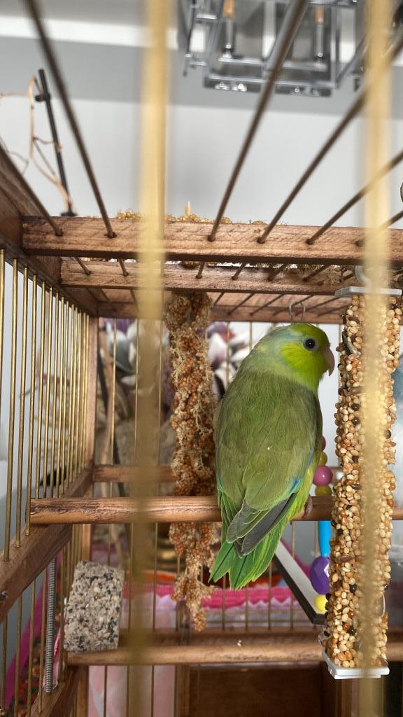 45-50 günlük yavru erkek herhangi bir sağlık sorunu olmayan forpus papağanı. Ötmesi azdır apartman dairesinde rahatlıkla bakılabilir. Boyutu ise Muhabbet kuşu kadardır